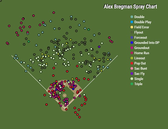 The latest big time callup, made quite the splash yesterday in his debut going 2 for 4 and slamming a 440 foot homer. As we can see by his Bb profile Judge hits the ball hard. He’s also a power hitter that hits fly balls,while maintaining his line drive rate at nearly 25%. When you remove his popups in the outfield (about 30%) his IFFB checks out in the mid to low single digits. The most impressive thing about Judge’s spray chart is the power to all fields. He’s nearly equal to right and left, with a majority of his homers leaving the middle of the park. Judge checks all the boxes. Unlike Bregman and Benintendi, Judge strikes out at a high ( 24%+) clip.