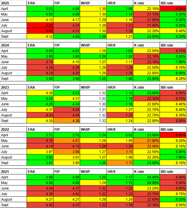 For this (ummm…) investigation(research project, statistical dive, ?), I looked at the years of 2021-2025. 2020 was, of course, a shortened season, so the data wouldn’t make sense, and going back any further gets us to a point where the game was different than the current version. For ease of viewing, I used a color coded system to show how the stats looked in monthly splits. This isn’t a multiverse, you don’t go on red. So green is good, yellow is mid, orange is not good, and red is bad, and these are made from a streaming pitching point of view, so K rate and BB rate are done in that manner. Yes, it’s arbitrary, and I did it on my own, but it hopefully gives a visual of the numbers.
