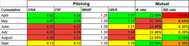 Regardless of the month, WHIP remains fairly consistent, with some occasional cases where early and late in the season are slightly better than the middle months. Coincidentally, when the ERA is bad, the HR/9 is higher. Yes, I would usually use HR rate, but the page I was using has HR/9 on the same page as all the other stats, and I didn’t want to move to another page just for one number. K rate is maybe the most random of the stats, but if it has any pattern, it also favors the beginning, and sometimes the end of the season. BB rate is the worst in the early part of the season. Pitchers getting settled into the season, and it generally gets better through the season.