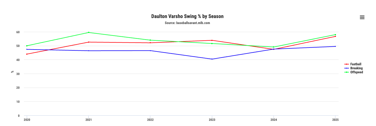 That’s first-pitch strike percentage. Finally, he went from a .198 hitter on offspeed pitches in 2023 — vomit — to .228 in 2024 — vomit — to a .318 hitter in 2025 — no vomit. He became a better hitter this year. This is all focused on his average, because he was a .210 hitter and last year it was .238. He needs to be a .235+ hitter to get the kind of value we want, so I’m showing you he can be there. Will he hit 40 homers after hitting 20 in a half year? Prolly not, but he has no splits and will play, due to his great defense. Will he steal 20 bags after stealing 16 bags two years in a row, but not stealing last year? Maybe not, but he’ll have chances. Will he hit .235+, yes. Power, speed and a better average? I want. For 2026 fantasy baseball, I’ll give Daulton Varsho projections of 79/29/71/.241/12 in 546 ABs with a chance for more.