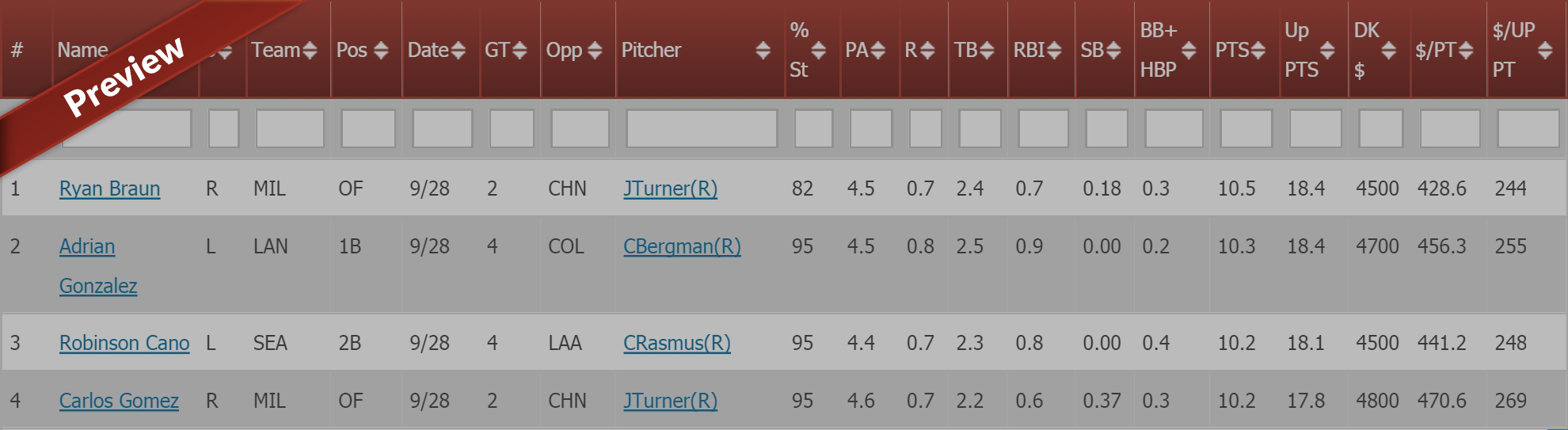 Razzball DFSBot for FantasyUp: Need help with your daily fantasy baseball picks? This tool provides daily fantasy baseball projections to help identify which hitters to choose for today on FantasyUp.com. DFSBot projections rely on Steamer Rest of Season projections as a foundation and then adjust based on several game-specific factors that include quality of opposing starting pitcher, hitter’s performance vs. the handedness of opposing starting pitcher, park factors, whether the game is home or away, and predicted batting order spot. Position and FantasyUp Salary (DK $) are directly from FantasyUp.com. All other stats/projections are from Razzball.