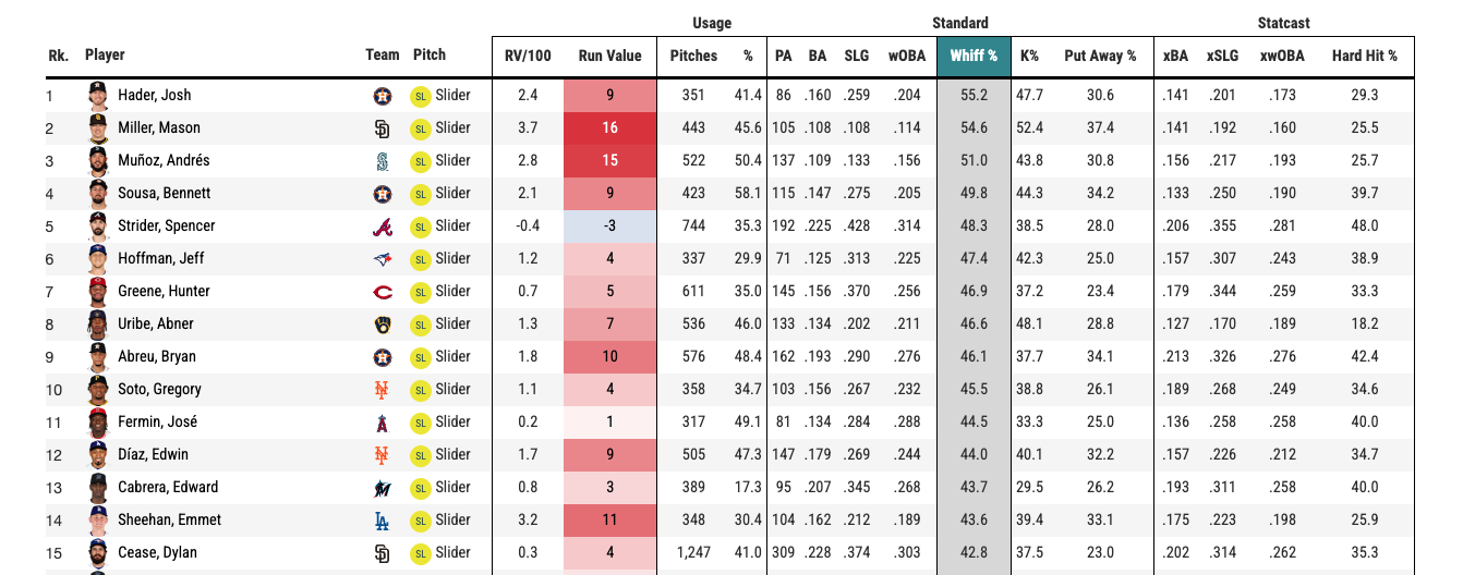 Edward Cabrera’s velocity was up, his pitch mix was completely different and absolutely worked for him. His curve that he threw 23.6% of the time had a .142 BAA. El oh el. C’mon, bro, I’m about to draft EdCab everywhere. That was the 2nd best curveball in the majors for starters, behind Framber Valdez for K%. Framber’s 44.6% vs. EdCab’s 44.3%. You might remember Framber had the best pitch, by K%, in all of the major leagues. Guess that means EdCab was 2nd best? Pretty good guess! Needs some caveats: To include EdCab in best pitch by K% in the majors, you’d have to drop the plate appearances down to 100, so relievers would enter the fray: