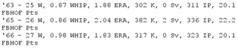 Had three 14+ FBHOF seasons between 1960 and 1964. During these three years he averaged 19 W, 1.05 WHIP, 2.62 ERA, 238 K’s. During the decade Drysdale won 18 or more games four times; had an ERA under 3.00 seven times, and a WHIP better 1.20 eight times.