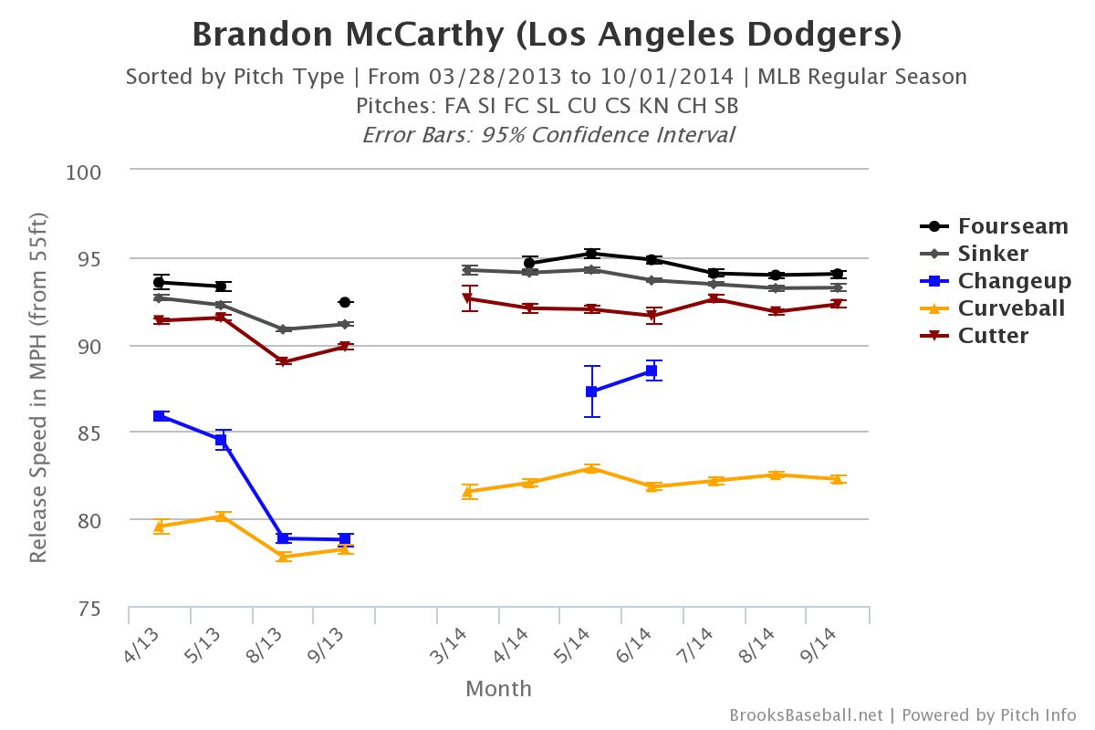 Pitch selection wasn’t the only major difference for McCarthy last season. Here’s a chart outlining his average velocity per pitch on a monthly basis from 2013-14: