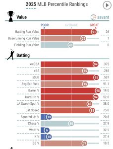 From an underlying metrics perspective, Baldwin looks like a hitter still climbing toward his power peak. His contact rates and zone control suggest the batting average floor is higher than most catchers, and there’s reason to believe the power output will continue to tick up as he matures physically and gains confidence attacking pitches he can drive. His batted-ball profile points toward room for growth in pull-side authority. Baldwin has shown flashes of loft gains without becoming overly fly-ball dependent. As that power develops, even modest improvements in HR/FB rate could push him into the mid-20s homer range over a full season. A realistic outcome looks like a .275 hitter with 20–25 home runs and solid counting stats relative to the position. He has a clear path to finishing as a top-five option at the position without ever being drafted as one.