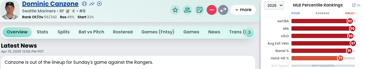 Dominic Canzone – I love this guy prolly more than is warranted, but, don’t get me wrong, some of it is warranted! Then again, I did this screenshot below for a reason as it includes his Statcast and how he’s out of the lineup: