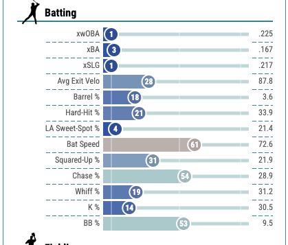 Jazz Chisholm Jr. – He has a WHOA HUH THAT SEEMS LIKE A HIGH strikeout rate, which is producing a COME AGAIN average? [staggering around like Redd Foxx, clutching heart] What happened to Jazz Chisholm Jr.? Was banking on his contract year, but it’s like someone put a contract out on his fantasy value. He’s got the Snow Miser Statcast: