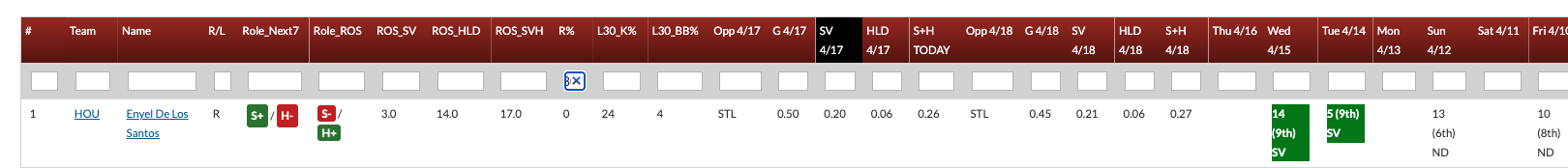 Enyel De Los Santos – Could be Enyel or Bryan King or just Josh Hader when he returns. Anyhoo! We have a new bullpen tool! Click the Autopen (if subscriber, you can get free trial) and click the SV column, Frank Voila! You have all the guys most likely to get a save for each day, and R% shows players’ ownership percentages, so scroll down until you get to someone under 100% (or you can enter <80 in the R% column or whatever number for the sort). It’s a new paid tool from Rudy. You’re welcome. Here’s a sneak peek: