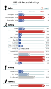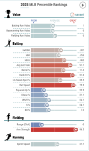 He hits with 1st percentile EV, takes few walks, and his glove ranks in the 15th percentile despite 97th percentile sprint speed. Let’s say he improves that glove a bit and gets fuller run? Well, he still poses roster build issues for our purposes. You need to make up the power drain so you will otherwise underdraft speed and perhaps Avg to offset Simpson’s extreme profile. But then what happens if Simpson loses PT? You now have a serious speed deficit. I would just straight avoid unless he got to a price where you are not counting on him as a full-time starter.
