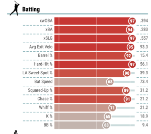The Dodgers versatile bowling superstar had already taken a tumble vs. last year as he was a mid 2nd rounder in 15’s in 2025. Now he’s dropped more to the early 5th round. We always seem to get early victory laps on the X machine when a pick like this goes well. And hey, it could happen. He’s 33 years old and hitting at the top of the Galacticos batting order. His accumulation stats will look great assuming he stays upright. Mookie still controls the strike zone like a zen master as he had a career low 10.2% K% and a 9.2% BB%. Unfortunately, that came with a career low 35.8% HardHit%, 5.5% Barrel%, which was his worst since 2016. He hit a career low .258 with 20 homers in 663 PA’s.