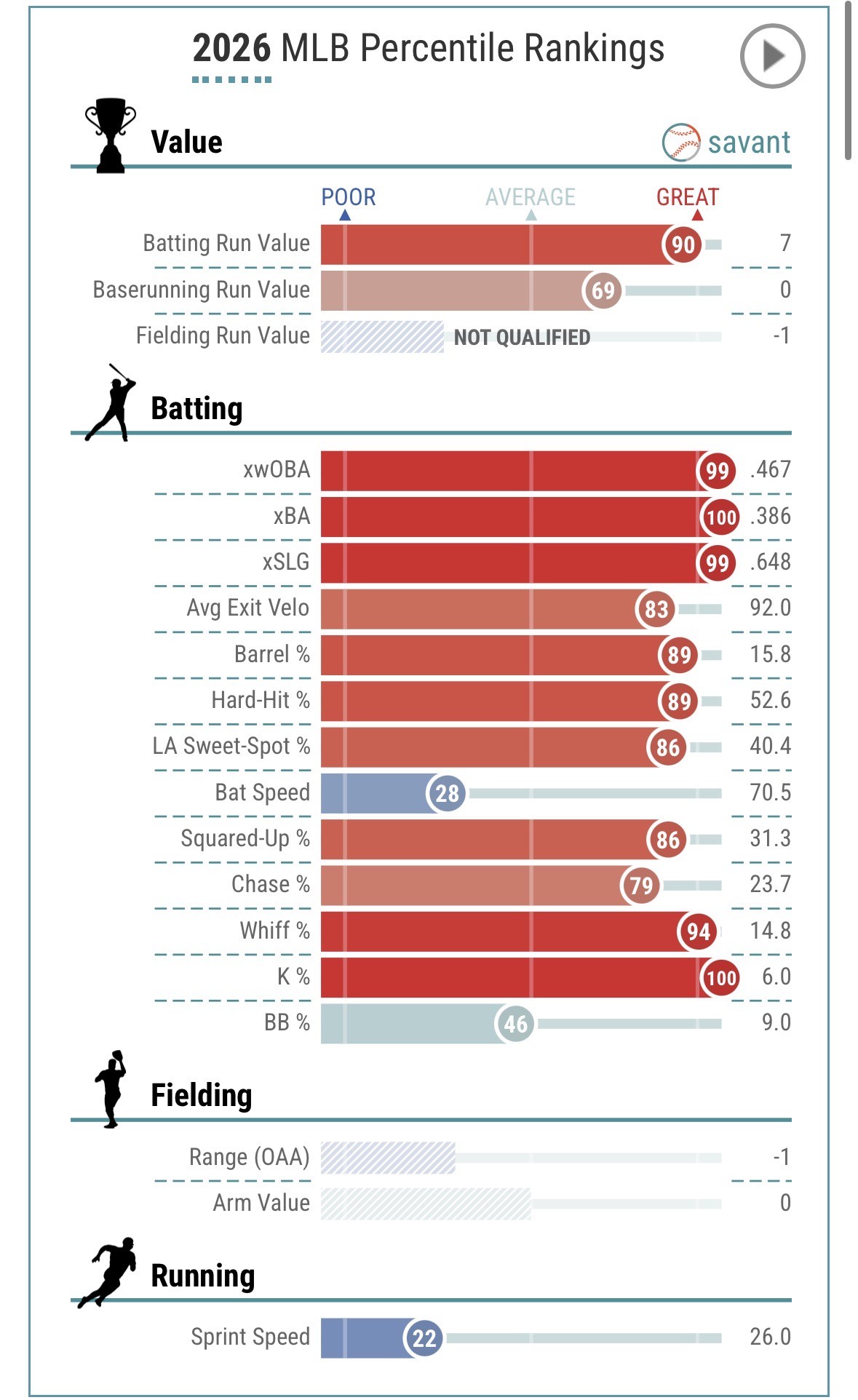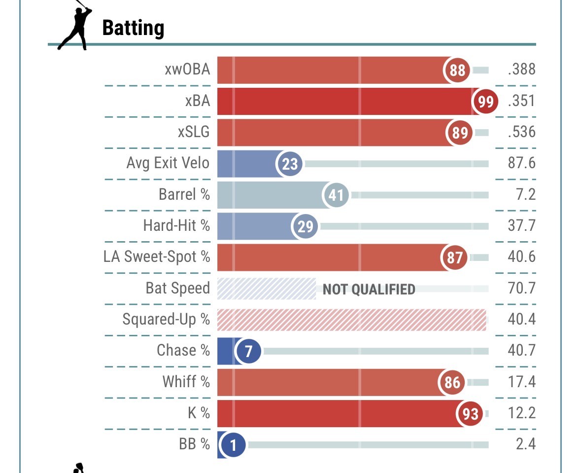 I have Tatis as well, had a look at his statcast page, mostly looks good! One glaring issue, however, his launch angle is a laughable 3.1; in other words, he’s beating (still hitting it hard) everything into the ground. K% is sightly elevated as well. We should start seeing some homers if he can start lifting the ball!! Let’s go Fun the Jewels!!