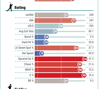 I could write out each of those numbers and spell them out, but here’s what that tells me. His bat speed is a liability and he can’t hit the ball hard anymore. That’s the profile of the aging hitter that scares me the most. A guy who’s still got his plate discipline, but when he hits the ball, it goes nowhere. His ExitVelo went from 92.4 MPH in 2023 to 89.1 MPH. This coincided with his position switch, so maybe it’s taking more out of him to play infield every day. Mine’s ain’t to reason why, but to do or die, and I’ll be damned if I’m drafting Mookie Betts. Stamp him schmohawk and avoid!