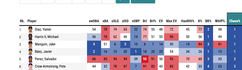 It also doesn’t help Pete Crow-Armstrong’s chase rate is hideously awful. His Chase rate in 2024 was 41.4%, and it got worse in 2025; it was 41.7. That’s what you call hideous. To go back to the weak contact, how hard is it to piece this together: Guy swings at ball in dirt outside the zone, where is that ball going if he makes contact? A dribbler to 2nd. Chase rate isn’t the worst thing a hitter can do, but it’s close. Here’s the worst last year: