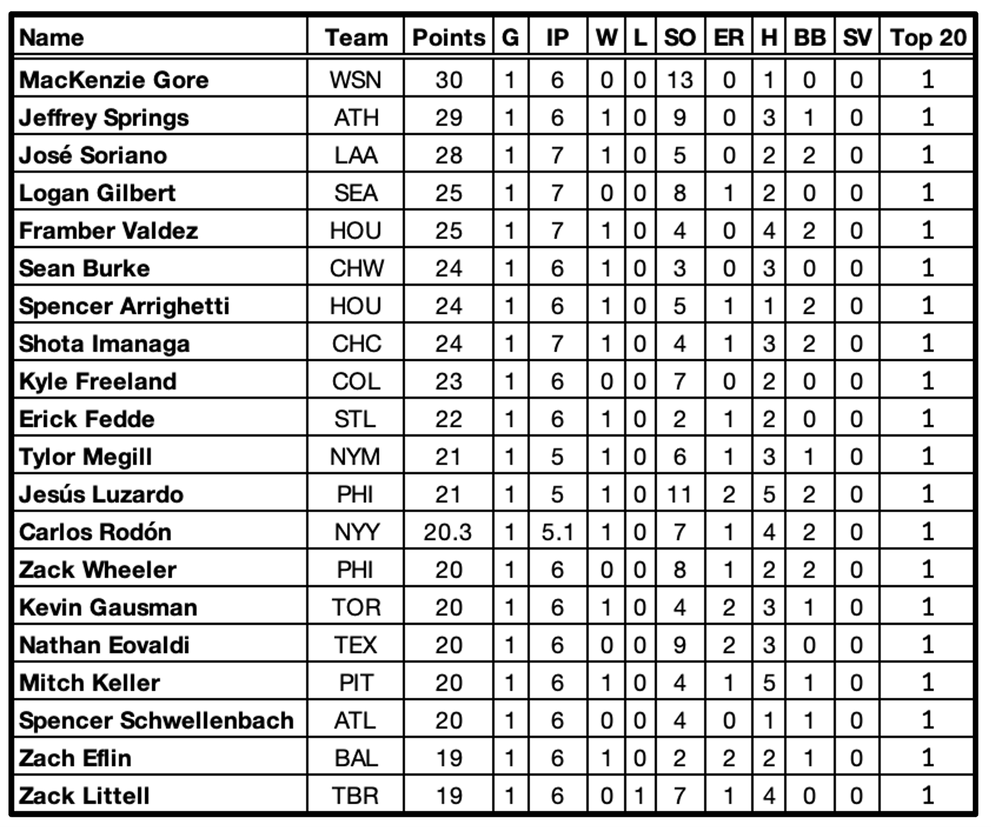 - Jack Leiter had a nice first outing for the Rangers, allowing one ER on 5 Hs and 4 Ks over 5 IP. The calculator says that’s 17 points and just outside the top 20 SPs. His next start lines up in Cincy, so we’ll revisit next week to see how he fares.