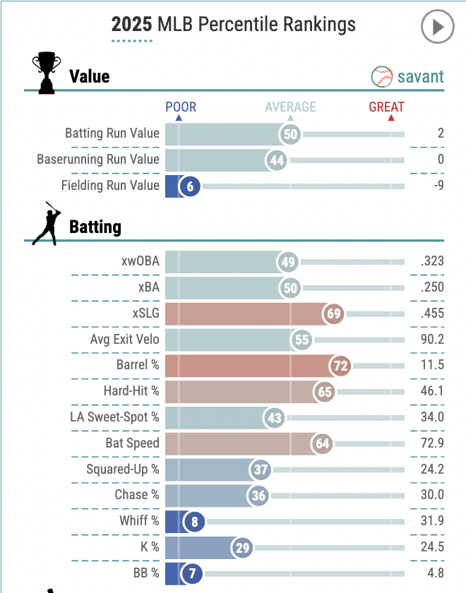 The one-time uber prospect finally put it together in 2025 as he popped 37 homers with 98 homers on a god-awful team. He even bumped his batting average from .207 to .236. And that may understate his improvement, as Statcast gave him an XBA of .260. The power metrics look very real, while the contact-oriented ones…not so much