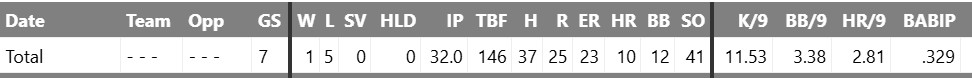 Joe Ryan – Ok. There’s an inevitable issue with Math when I rank a few guys higher than they’re showing up in other rankings. It pushes down some names projected to produce in a better draft slot. Do I believe in Joe Ryan’s metrics? Of course I do. When a 22.2 K-BB% lands you in fourth place between Paul Skenes and Bryan Woo, it seems really silly not to have said player ranked at least in the Top 10. My biggest question marks with Joe Ryan are how much support he’s going to get while he’s stuck in Minnesota, and was there anything under the hood that explains his rough finish to the season? Ryan’s last 7 GS looked like this…