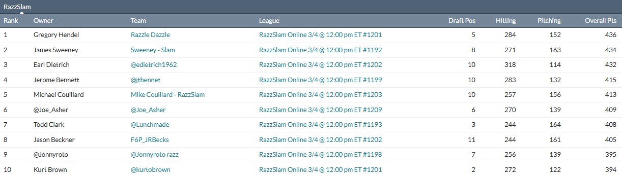 Each week we’ll also take a look at the top ten overall standings in our other Razzball sponsored league, the RazzSlam. This is our NFBC Best Ball league with managers from all across the industry, from content providers to fans and readers just like you.