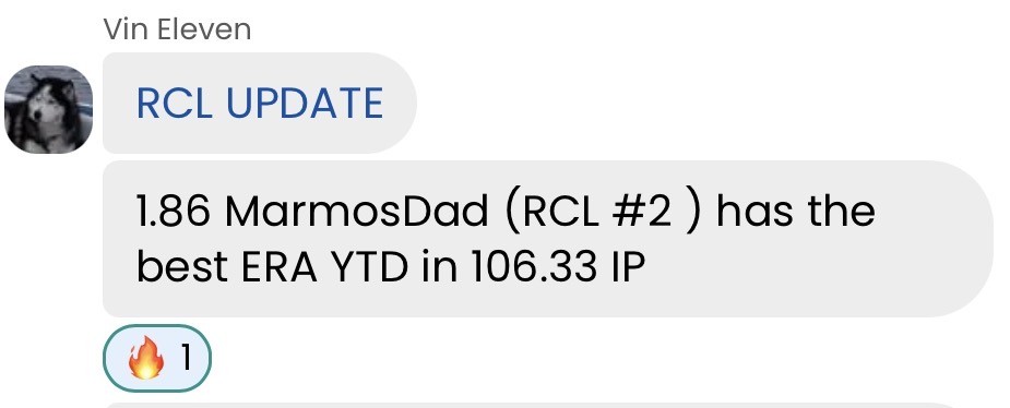 There were new weekly records in Runs, HRs, SBs (thank you), AVG, Ks, and a tie for the Saves mark. Early on we should get a lot of new records each week. I have to think there is a disgruntled Yankees fan in RCL 35 with that team name.