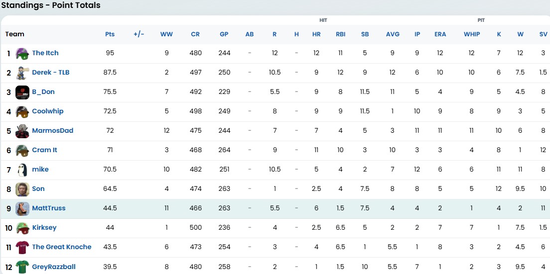 The Itch took over the top spot this week, gaining 7.5 points while leading the league in Runs, HRs, and WHIP. Mike C was the biggest point gainer this week though, adding 22 points to their total and moving into seventh place. Going the other way this week was Cram It, who dropped 17 points and fell four spots down to sixth. Silly season.