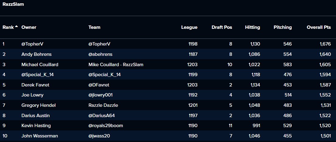Each week we’ll also take a look at the top ten overall standings in our other Razzball sponsored league, the RazzSlam. This is our NFBC Best Ball league with managers from all across the industry, from content providers to fans and readers just like you.
