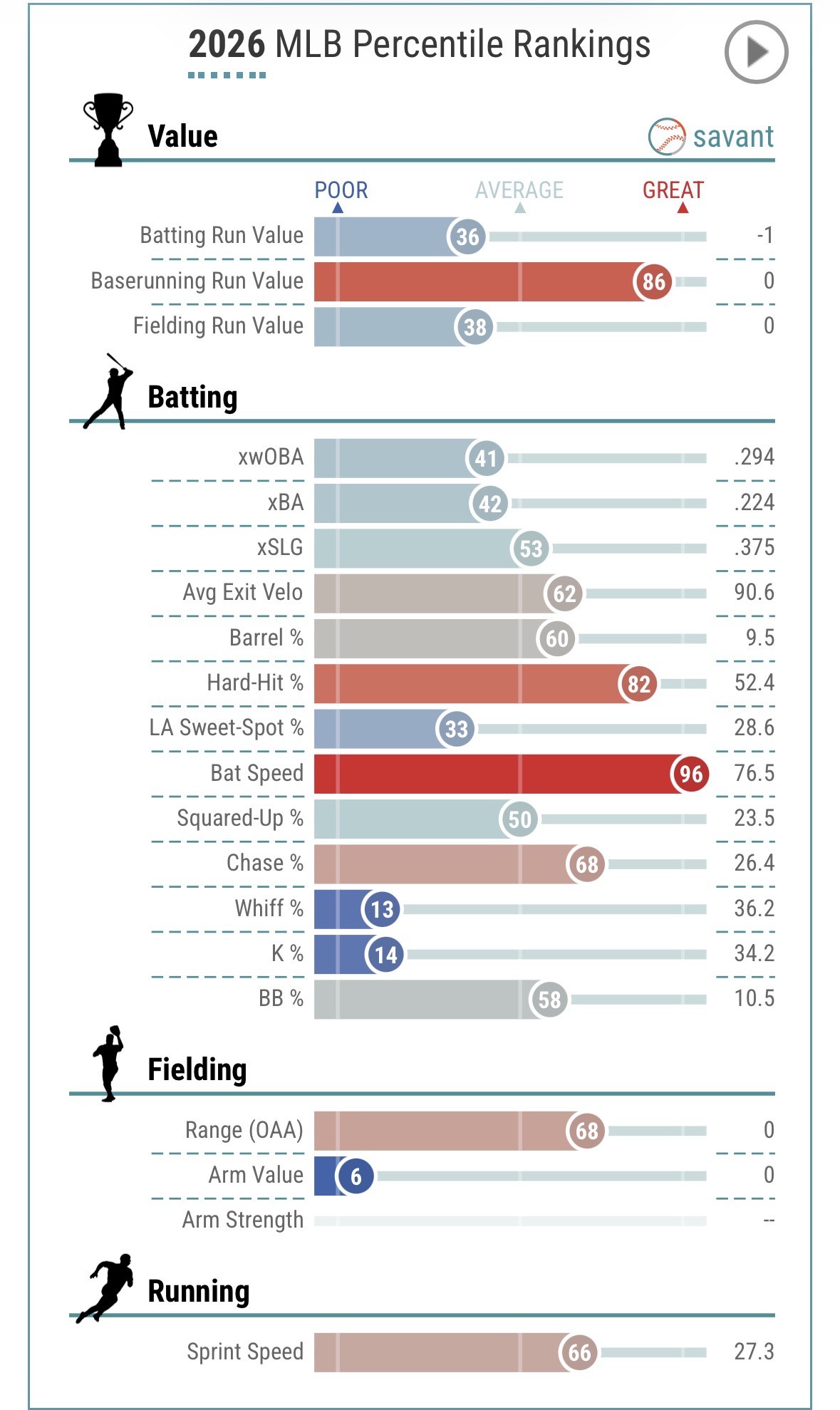 Chase Burns – 6 IP, 1 ER, 6 baserunners, 9 Ks, ERA at 0.82. Again, for like the tenth time in this post, it’s too early to look at peripherals, but I just looked at Burns’s and did a boing.