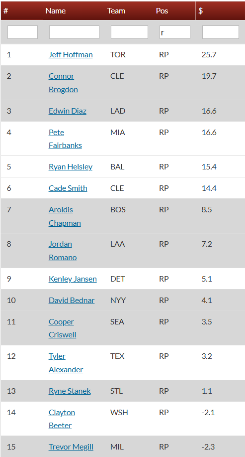 Okay, so first, a note on the Player Rater screenshots above. I filtered out guys with bloated values due to random wins. I won’t be doing that down the road, but it’s necessary this early. Wanted to try to whittle it down to where only guys earning high-leverage decisions got included. It’ll level out as the season moves on, of course. The #1 RP right now is A.J. Blubaugh…that’s, um, bound to change.