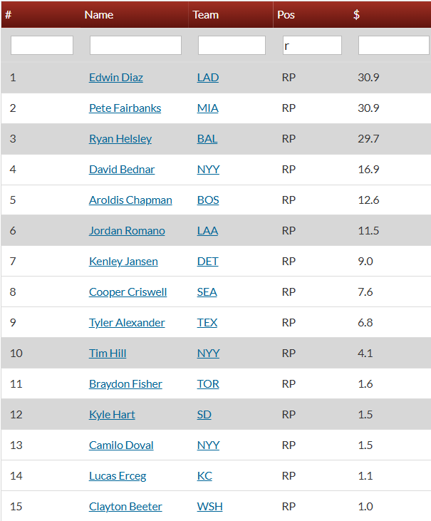 Don’t forget to keep that there Razzball Bullpen Chart bookmarked. It’s been updated with the latest, and I’m usually quick to get it touched up once any type of news drops. And if you’re not a subscriber, I do highly, highly, highly recommend it. If’n you’re of the mind to consider it, you can find all the info here. I’m partial to the Relievonator Game Log Tool. It shows the last two weeks of relief appearance game logs. Every single one. And the inning they were called in. It’s gold.