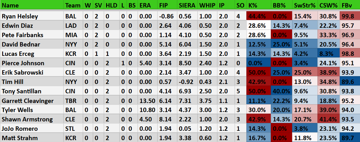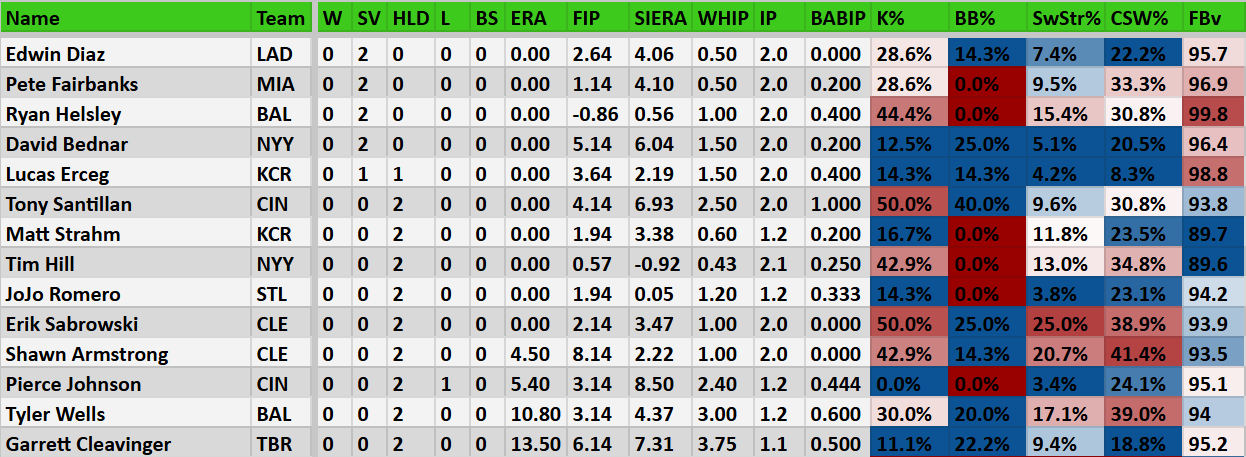 David Bednar hasn’t looked his sharpest, yet he’s been able to get out of it thus far, converting both save opportunities. His crystal clear 0.00 ERA is not supported by his 5.14 FIP and 6.04 SIERA, however.