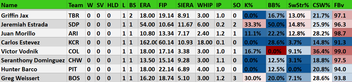 Carlos Estevez headlines due to a disastrous debut. Folks were worried about his truly dismal Spring Training numbers, in which he did basically everything except record outs. Velocity was down about 5 points. Bad velocity this early is very normal for him, but we only got marginally better in his first outing: 91.2 avg mph. That’s better than the sub-90s we were seeing in ST, but still not up to par. And frankly, Estevez is just not a good enough pitcher if he doesn’t have that velocity. His control was all over the place, and ultimately, he gave up a walk-off grand slam. The real kicker is before that, he took a comebacker off his ankle. Postgame everything sounded fine and manager Matt Quatraro wasn’t shying away from using Estevez as closer moving forward. But then the next morning, Estevez is in a walking boot and Quatraro is saying Estevez probably needs some low leverage to find his mojo again. You most assuredly need to grab Lucas Erceg for the time being if you still can. I do think Estevez rounds into shape and ends up being one of the better sources of saves out there…assuming he’s not actually hiding an injury. The ankle still doesn’t sound serious even if a short IL stint is in order, but if there’s something much more concering that’s causing that velocity suffer, it’ll be game over. I’m personally choosing to believe he’s just been lazy this offseason and isn’t truly in game shape yet. Time will tell, I s’pose. As for Erceg, it’s early…but those metrics ain’t looking promising. Of all RP with 2 SVHD, Erceg is the only one with a single-digit CSW%. Said before the season I like Matt Strahm more, and I reckon he’s the better SVHD option by the end of this year.