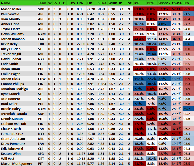 Devin Williams 2 SV, 3 K, healthy CSW%. His owners have to be happy about his start to this season, given how last year went when he was on the other New York team.