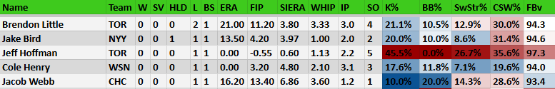 Jeff Hoffman had 1 BS and 1 L to show for what was otherwise a beastly week (5 K, 45.5 K-BB%, 26.7 SwStr%, 35.6 CSW%).