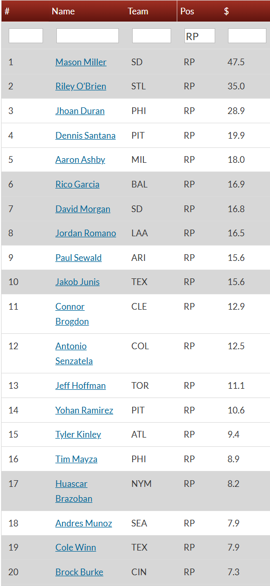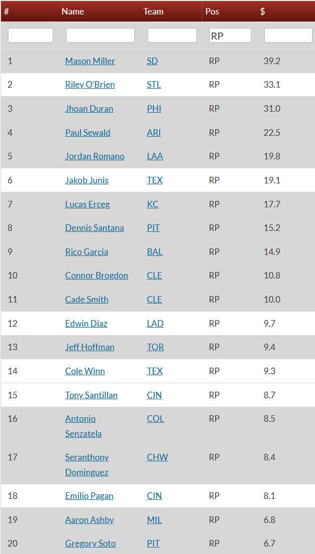 Jhoan Duran 2 SV, 1 K. Overall, Duran is #3 RP in the game according to the fine Razzball evaluation systems you see in the pics above. So far his line pretty much rules: 1-1, 5 SV, 0.74 FIP, 0.75 WHIP, 8:0 K:BB.