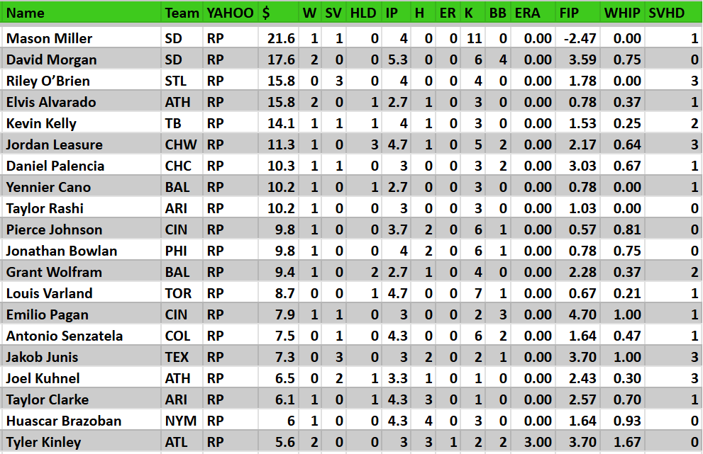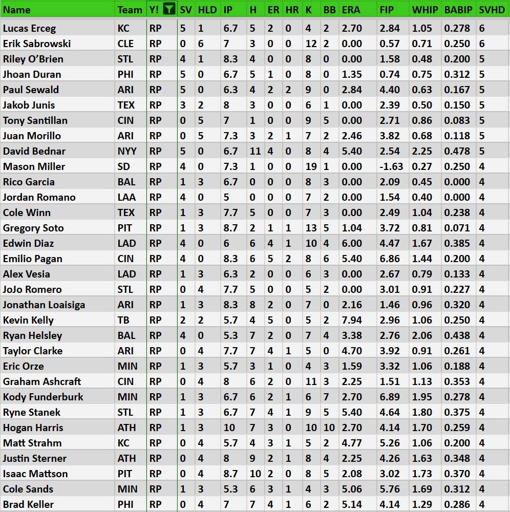 Justin Sterner 3 HLD, 4 K. Less than ideal 1.70 WHIP this week. Still, I like that he’s getting high-leverage looks, one after the other. They’ve leaned heavily on him and he’s managing to get it done. Wouldn’t be shocked to see him start earning some SV pretty soon.