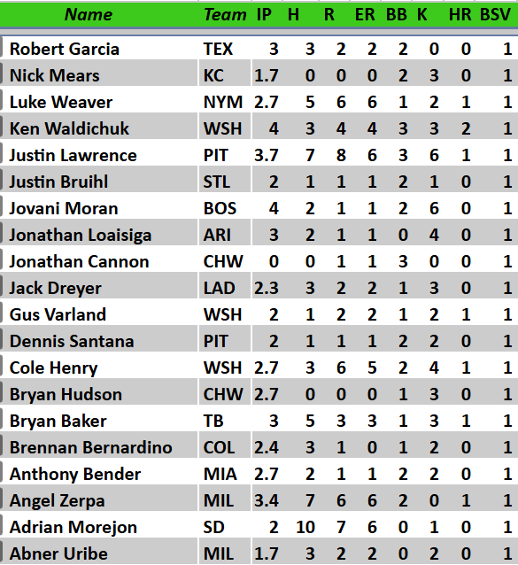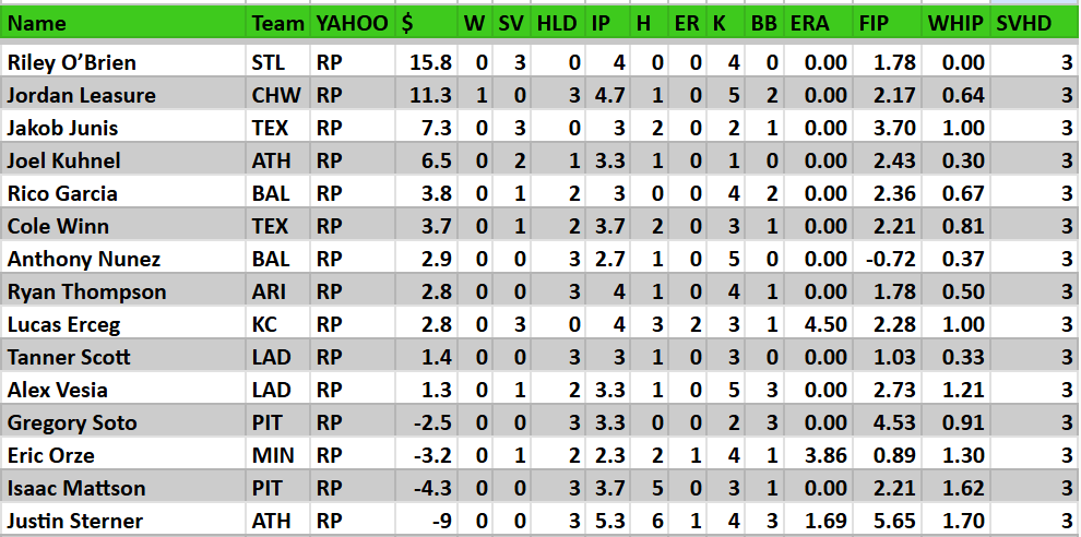 Joel Kuhnel 2 SV, 1 HLD, 1 K. Still don’t know who this guy is. But in deeper SVHD formats, he’s looking like an add for now. Boring but effective, and the A’s pen is such that the hottest hand will prevail.