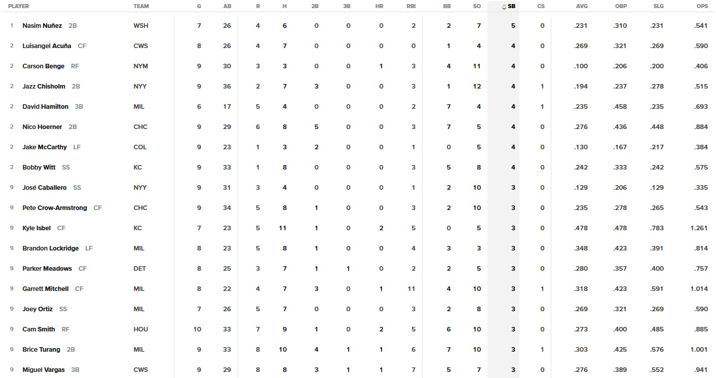 Did any of you see me mention Nasim Nunez last week and how he would be gone everywhere later this month, so grab him now? Well, he might be gone already. Last chance to get the 2026 MLB stolen base leader on your roster, Nasim Nunez. Also, look at all those other top fantasy draft picks stealing bases…like Carson Benge, Luisangel Acuna, David Hamilton, and Kyle Isbel. Also, Miguel Vargas is on the leaderboard, he could be Matt Chapman of 2026. There’s always stolen bases on the waiver wire.