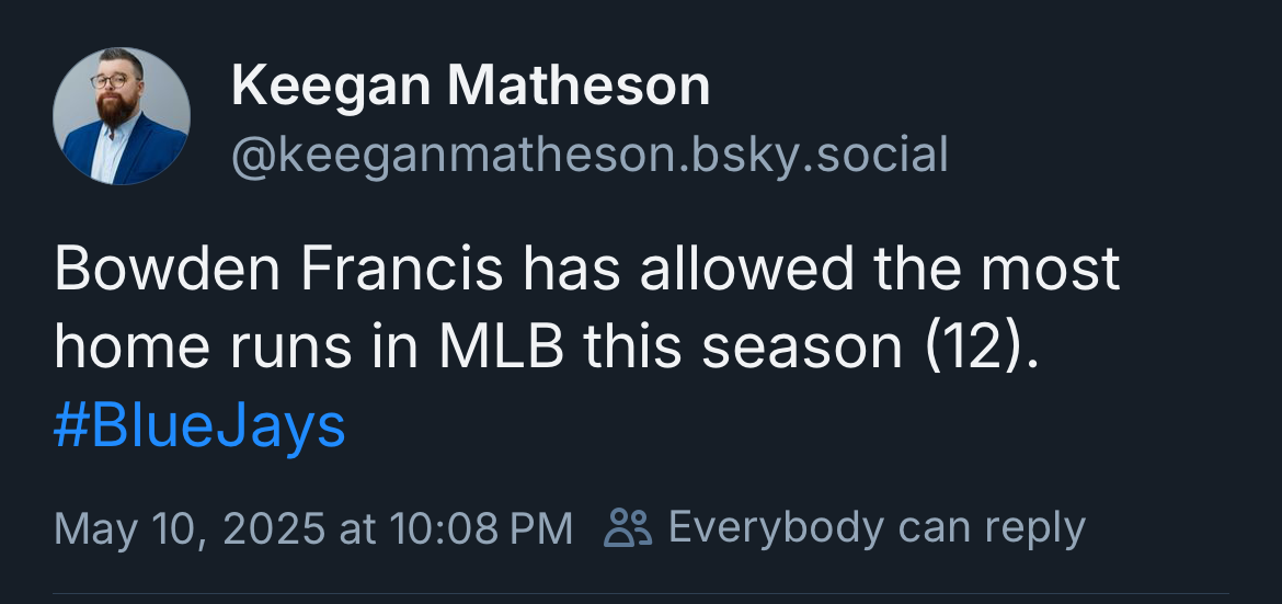Bowden Francis – Yes, for whatever kudos I deserve for hitting the Bryan Woo call, let’s now forget how much I also trumpeted so much hype for Bowden Francis. That one has blown up bigger than Dizzy Gillespie’s cheeks. I’ll give you this trivia question answer from the Jays’ MLB beat reporter, Keegan Matheson too.
