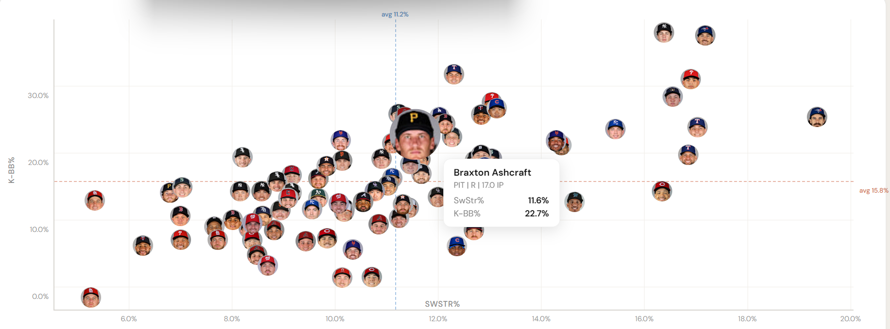 That’s where the scatter plot comes in. I played around for a bit, then decided to run a K-BB% (Y-axis) and SWSTR% (X-axis) to see where Braxton Ashcraft landed.