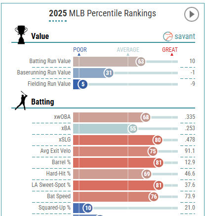 the one thing about him is he strikes out way too much for someone with his low exit velo. even in his 2023 season he k’d almost 29% of the time. that’s the thing that has me off him. he did walk more in 2025 but still just average bb rate