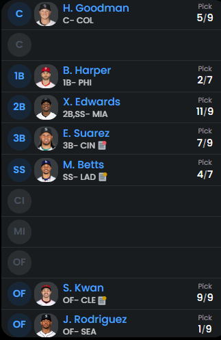 19.279 Dylan Beavers. I debated Justin Crawford with this pick. I thought I could wait a round. DVR scooped him six picks later. Crawford was one of the only remaining players who could help fix my steals deficit. Beavers is a bit of a mystery box. He could be anything. Even a boat that steals almost as many bases as Crawford. It’s weird how decisions in the late 200s can feel more impactful than the first rounds.